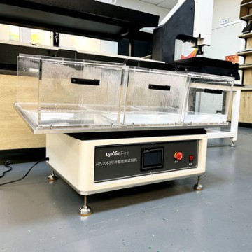 个平面上,该平面由通过凸轮和杠杆带动以26r/min的转速前后振荡。每个朔料箱上配有透明的朔料盖,以便控制水的飞溅及观察测试过程。